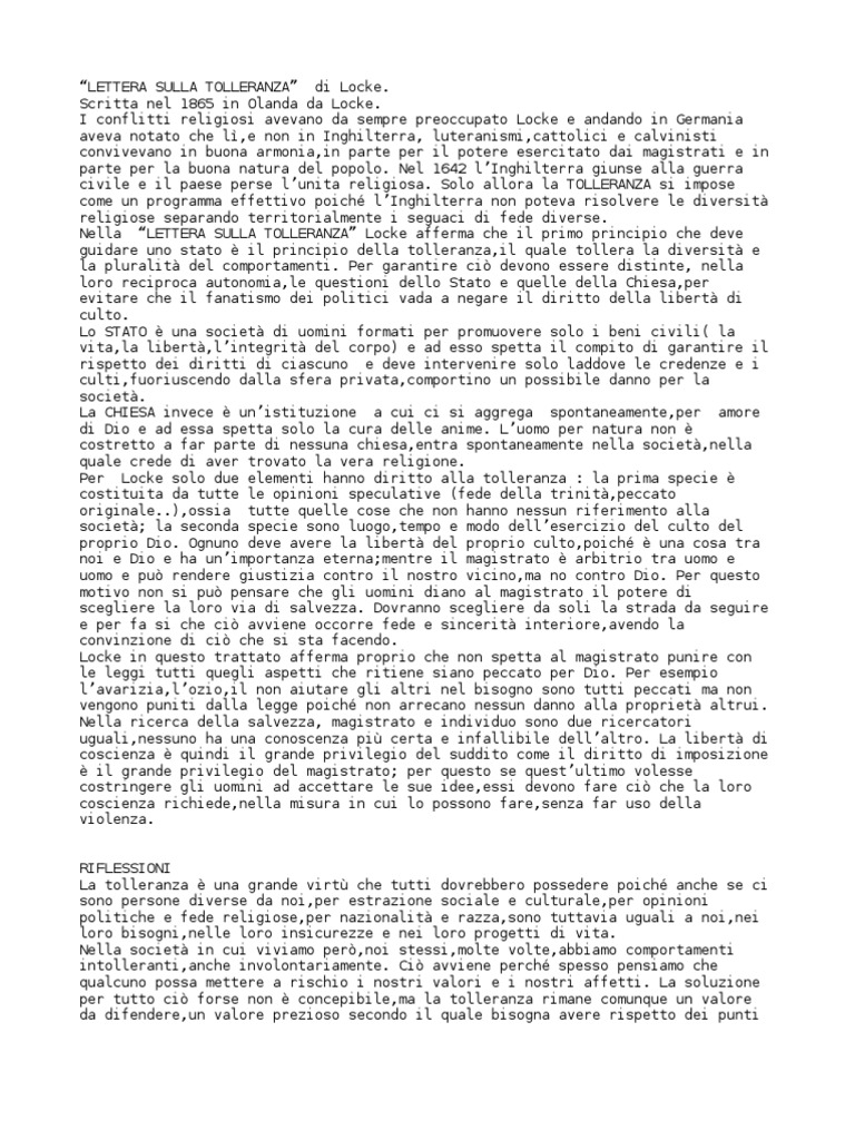 Locke:lettera Sulla Tolleranza - Appunti di Filosofia gratis ... Locke: Nella “lettera sulla tolleranza” si limita ad escludere dalle competenze del magistrato civile le questioni religiose e a sostenere la separazione tra ... Locke, John - Lettera sulla tolleranza Scritta nel 1685 in Olanda da John Locke, pubblicata anonima nel 1689, la Lettera sulla Tolleranza è presto divenuta una pietra miliare nel dibattito sulla ...