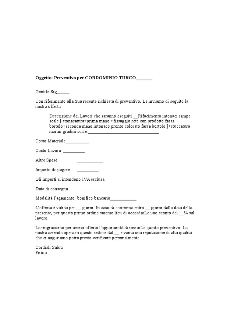 Fac simile lettera preventivo. Offerte e preventivi - Office.com I modelli di preventivo gratuiti ti consentono di mettere per iscritto la tua stima di costi e di includere un elenco dettagliato delle tue tariffe. In questo modo, in caso di domande sulla portata o sul costo del tuo lavoro, potrai consultare con precisione il tuo modello di preventivo e fornire la risposta corretta. Fac Simile Di Preventivo Assicurazione Trattore Agricolo FAC SIMILE DI PREVENTIVO ASSICURAZIONE TRATTORE AGRICOLO - natura del mezzo il preventivo assicurazione trattore agricolo non segue le normali regole. Vediamo insieme le..esempio in fac simile di dichiarazione di terzo pignorato da parte di Equitalia. ... Fac simile lettera di restituzione beni aziendali Dic 21, 2019 Redazione by Redazione su ... Fac Simile Lettera Rifiuto Preventivo - modulieditabili.com La compilazione è molto semplice, basta infatti inserire i dati mancanti negli spazi presenti nel documento. Una volta compilato, il fac simile lettera rifiuto preventivo può essere convertito in PDF o stampato. Fac simile lettera rifiuto preventivo 1 file (s) 11.50 KB Scarica Altri Moduli Utili da Scaricare Fac Simile Mandato di Agente Generale Fac Simile Richiesta Preventivo - modulieditabili.com Modello Richiesta di Preventivo Editabile da Scaricare In questa sezione è presente un modello richiesta preventivo da scaricare. Il modulo richiesta preventivo compilabile messo a disposizione è in formato DOC, può quindi essere aperto e compilato utilizzando Word o un altro programma che supporta questo formato.